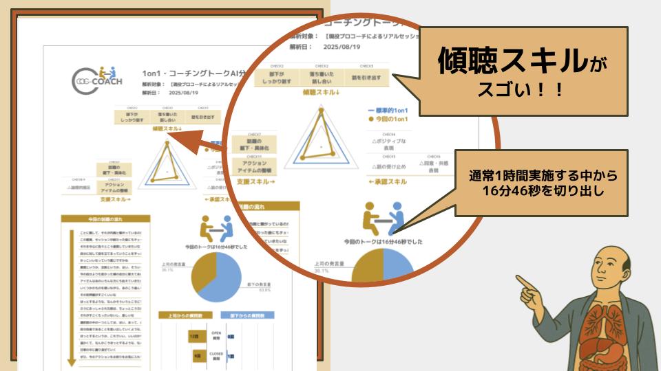 分析結果はレポートとして可視化され、後から関わり方の質を振り返ることができ、
