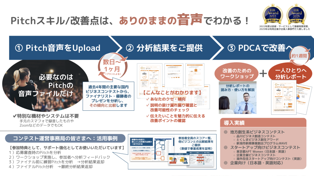 Pitchやプレゼンの機会が増える一方で、評価は属人的・定性的になりやすく、改善の方向性が見えにくい課題があります。