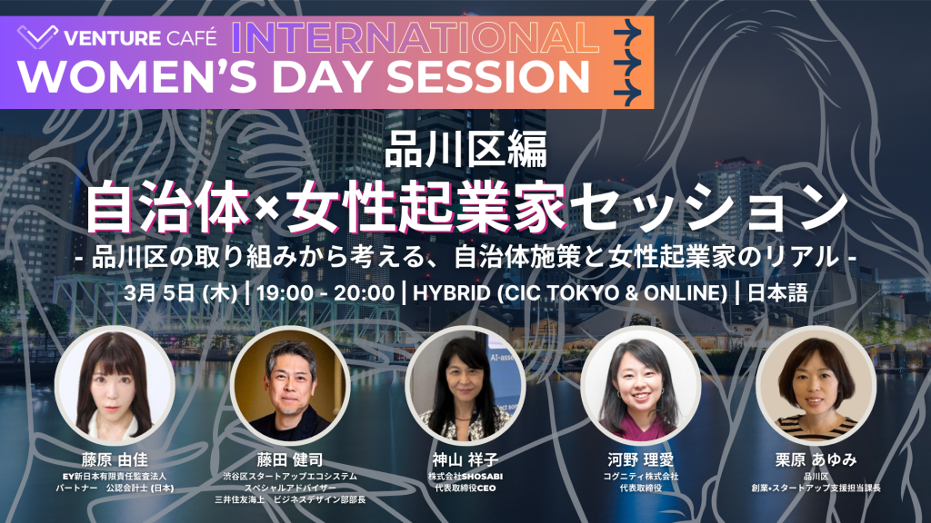 2026年3月5日、Venture Café Tokyo「Thursday Gathering」で開催された「自治体×女性起業家セッション(品川区編)」に、コグニティ株式会社 代表取締役の河野理愛が登壇しました。
