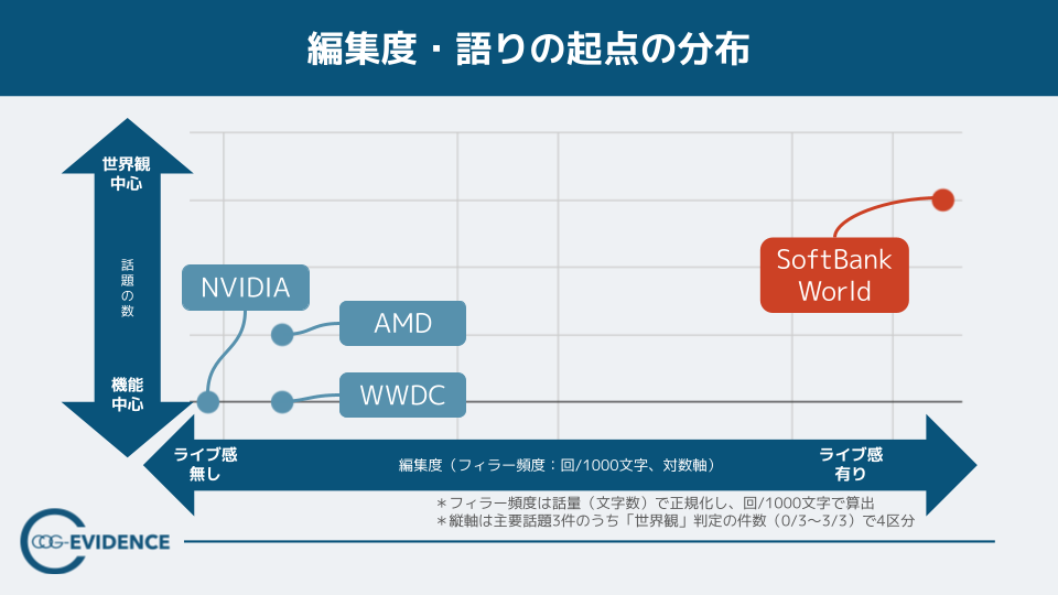 そこで着目したのが「語りの起点」です。分析の結果、SoftBank Worldでは「人間と技術進化」といった世界観を起点とする傾向が強く、CES/WWDCに多く見られる「目標から逆算する構造」とは異なる設計であることが確認されました。