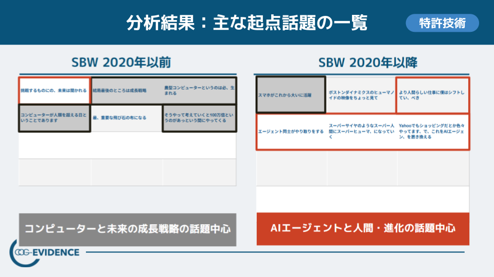 さらに近年では、起点となる話題が「コンピューター・成長戦略」から「AIエージェント・人間・進化」へと移行し、情報量を増やすのではなく“焦点化”による伝達設計が強まっていることも確認されています。